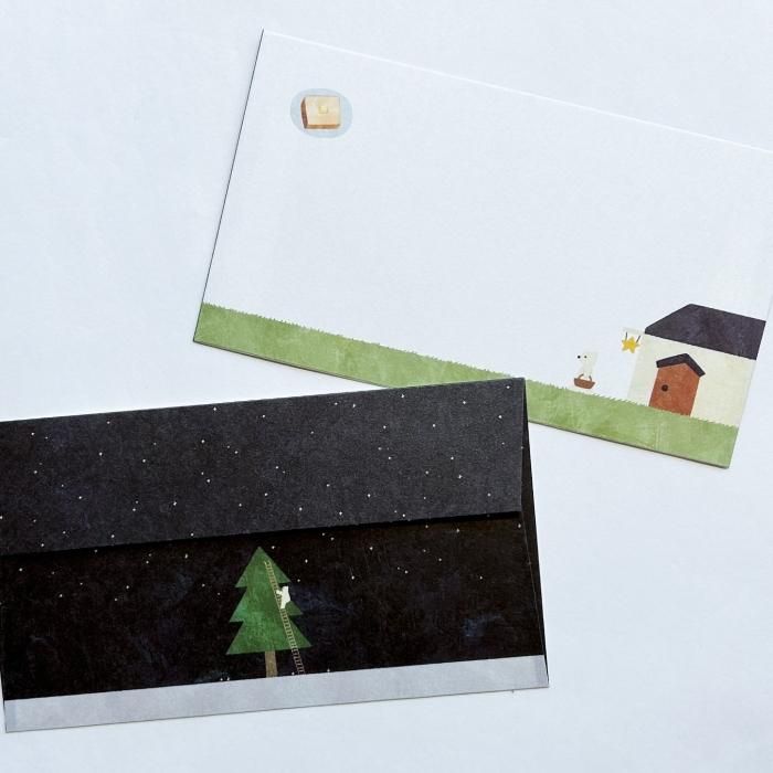 封筒は表と裏で便箋と同じ2柄が使われて、まるでポストに絵本が届いたように感じられますよ、きっと。