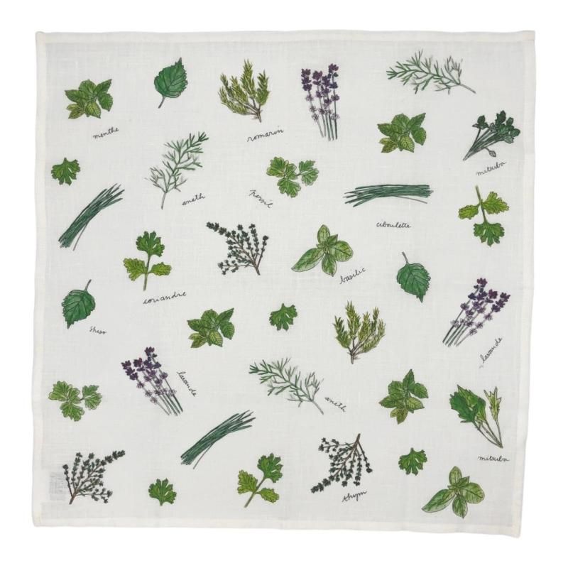 fog linen workの真っ白なリネン生地に、パリ在住のアーティスト、イザベル・ボワノさんの描くハーブをプリントしたハンカチ。