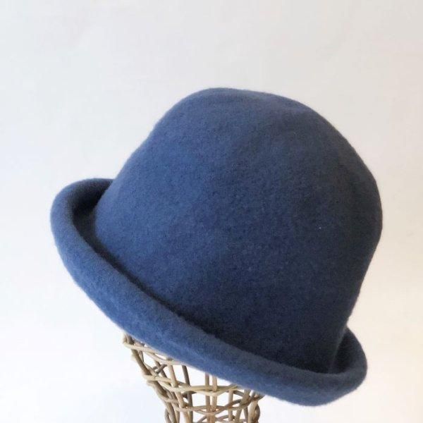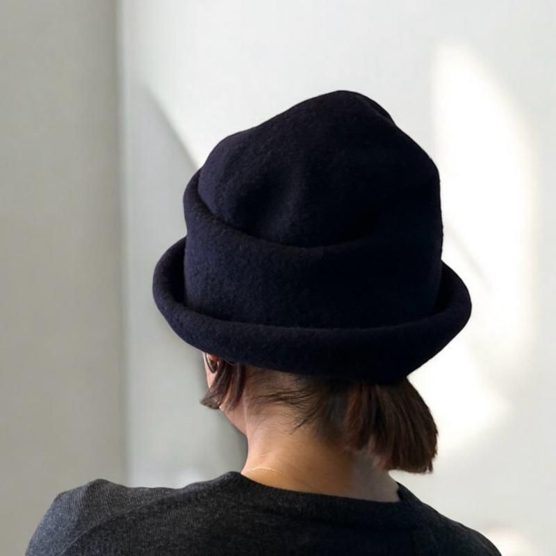 いったん内側に折りこんだリムを少しだけ外側に折り返して、頭頂部をちょこっと凹ませてかぶるもよし