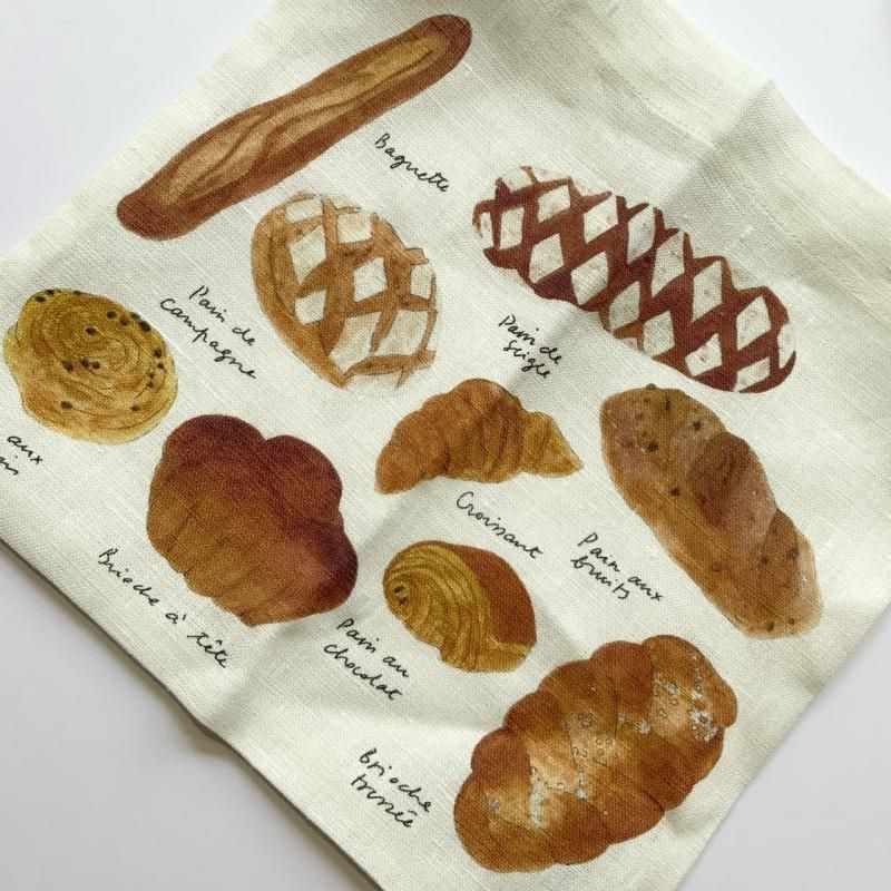 イザベルさんの描くブルー系のいろいろな種類のカフェオレボウルと、こんがり焼けた美味しそうなパンの数々が、プリントされています。