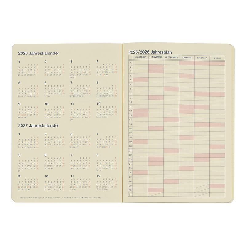 中身は2026/2027年のイヤーカレンダー(1月〜12月)、イヤースケジュール(2025年10月〜2027年3月)、月別ダイアリー(2025年10月〜2026年12月)のほかは、29ページの方眼メモ。