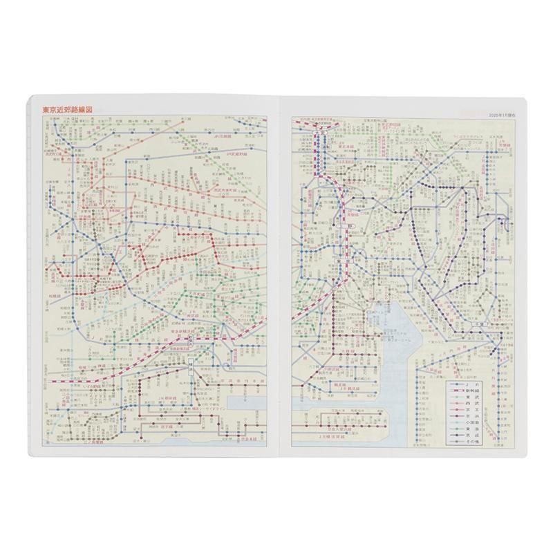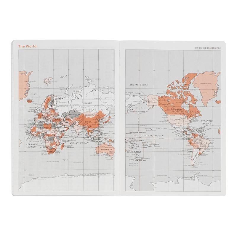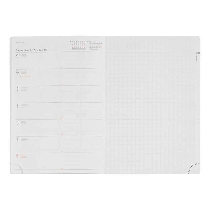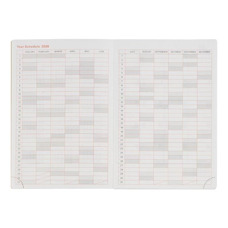 中は、見開き一か月のマンスリーと、左ページに一週間/右ページに方眼メモページのウィークリーのフォーマットがあり、年間・月間の一目でわかる予定表もあります。