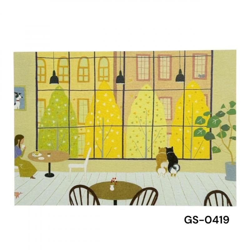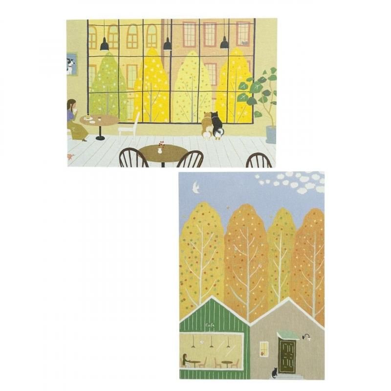 犬と猫がいるカフェの風景が、秋らしい色合いで描かれています。