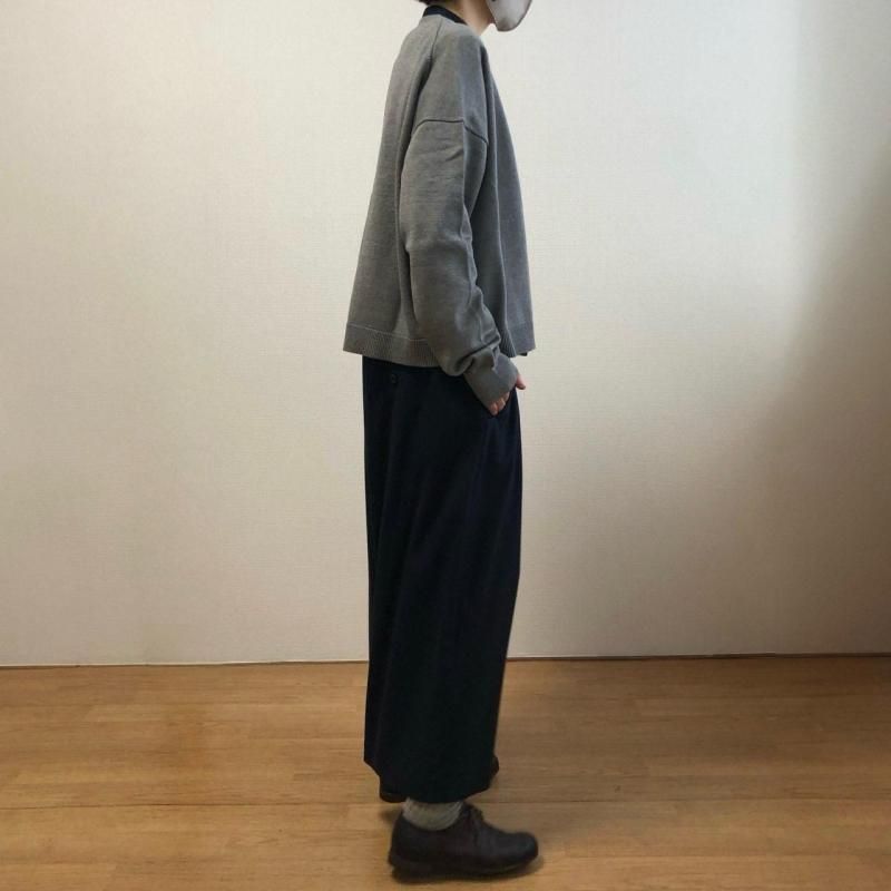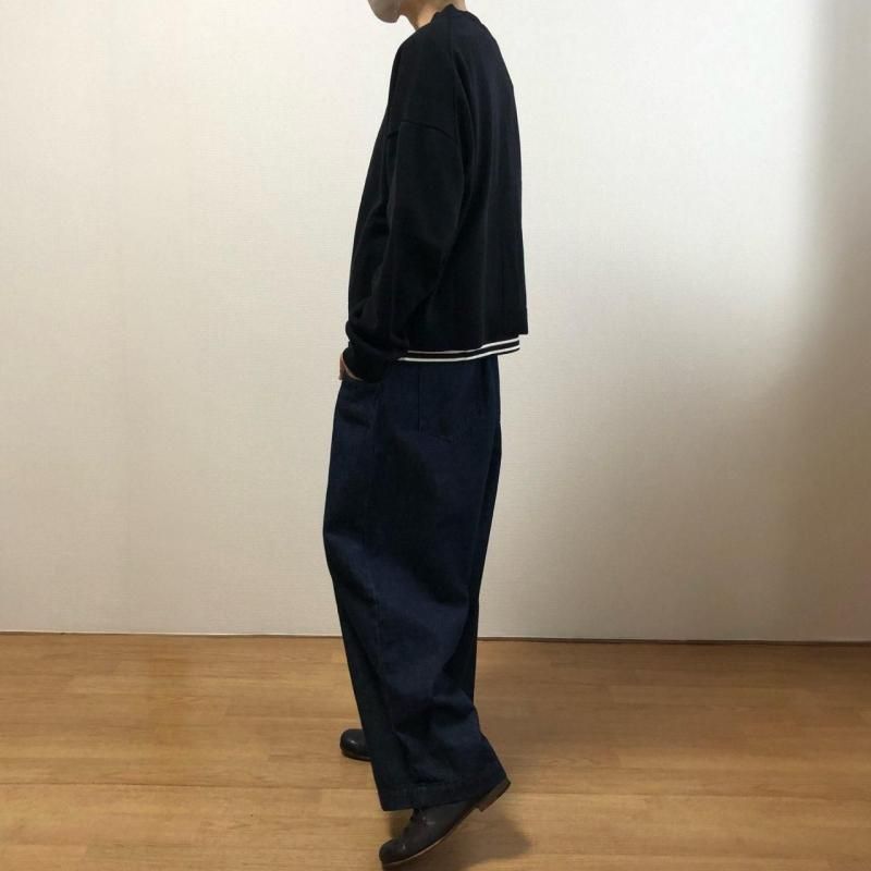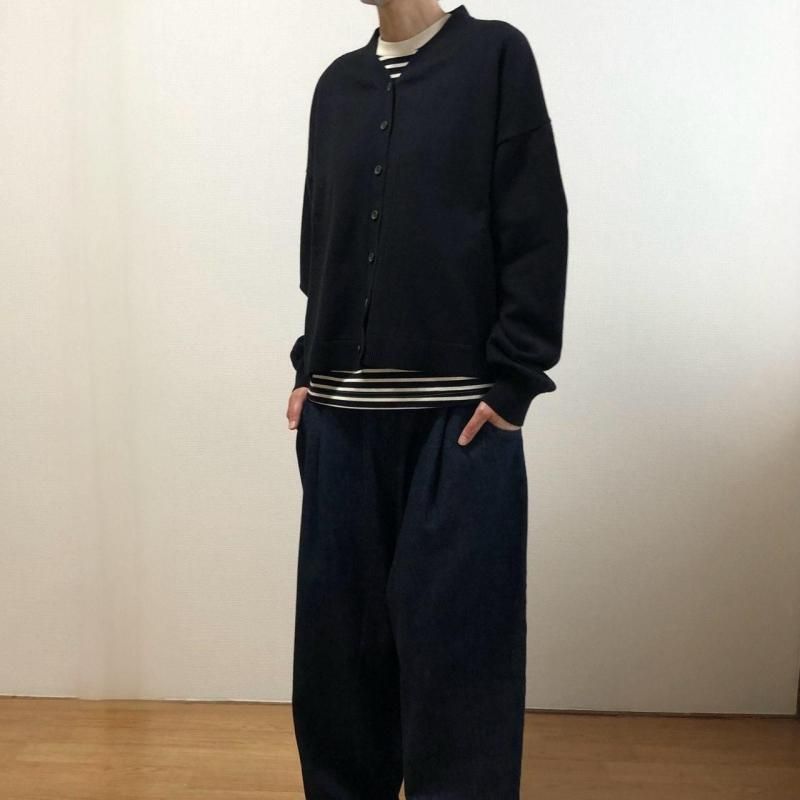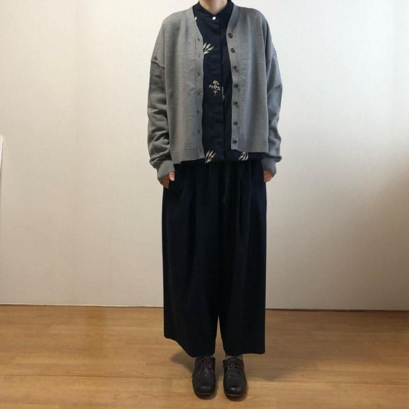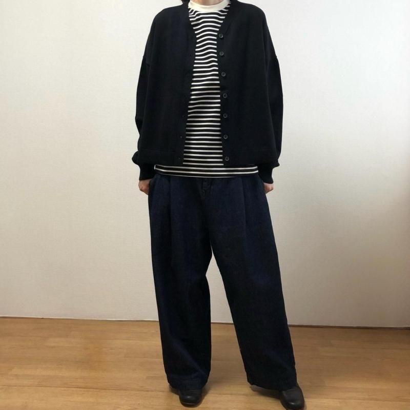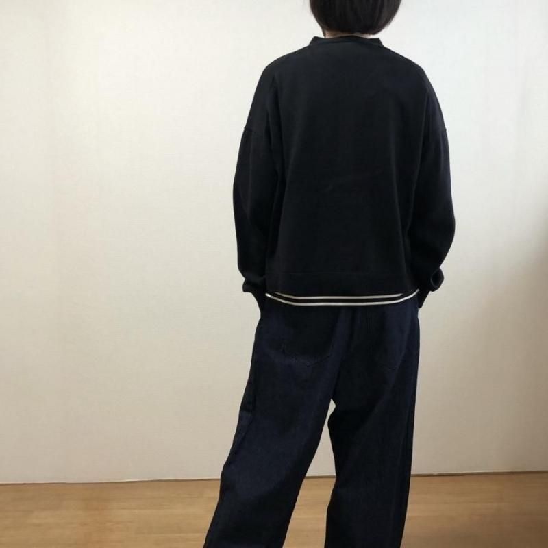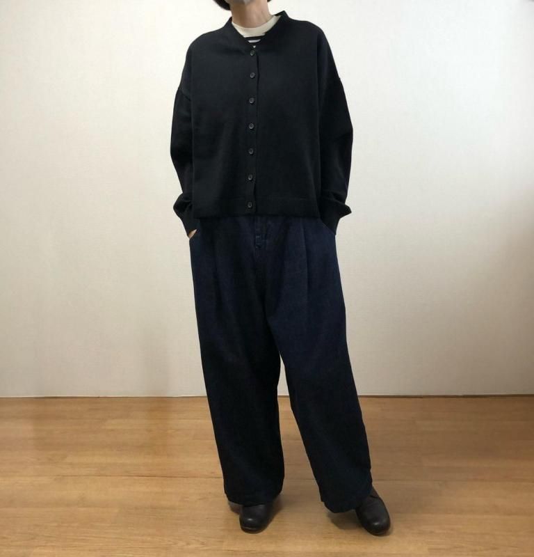 身幅や袖幅はゆったりとし、リラックス感のあるシルエットですが、着丈はややショート丈に仕上がっているため、ボリュームのあるボトムとの相性もいいですね。