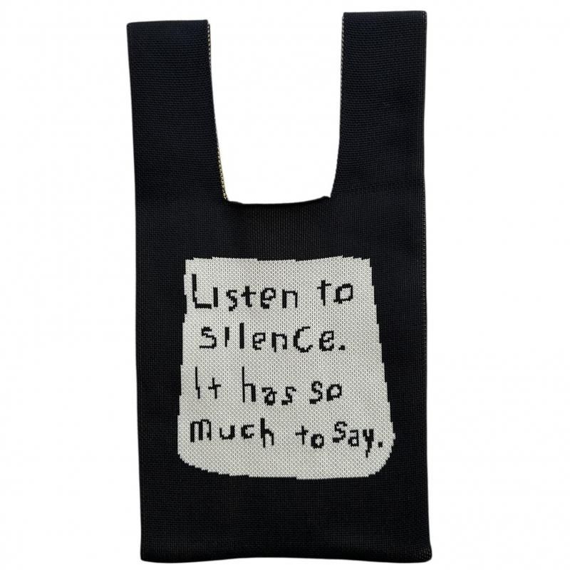 もう片側は英語で「静けさに耳を傾けなさい。沈黙には多くの意味がある」という文字が、クラフト感のあるニットの編み目で表現されています。