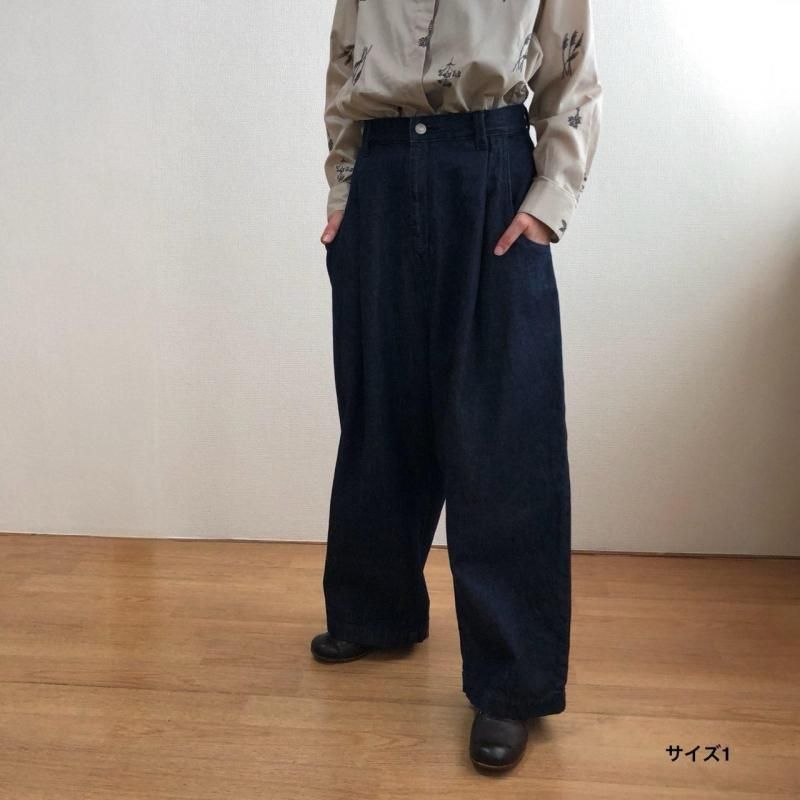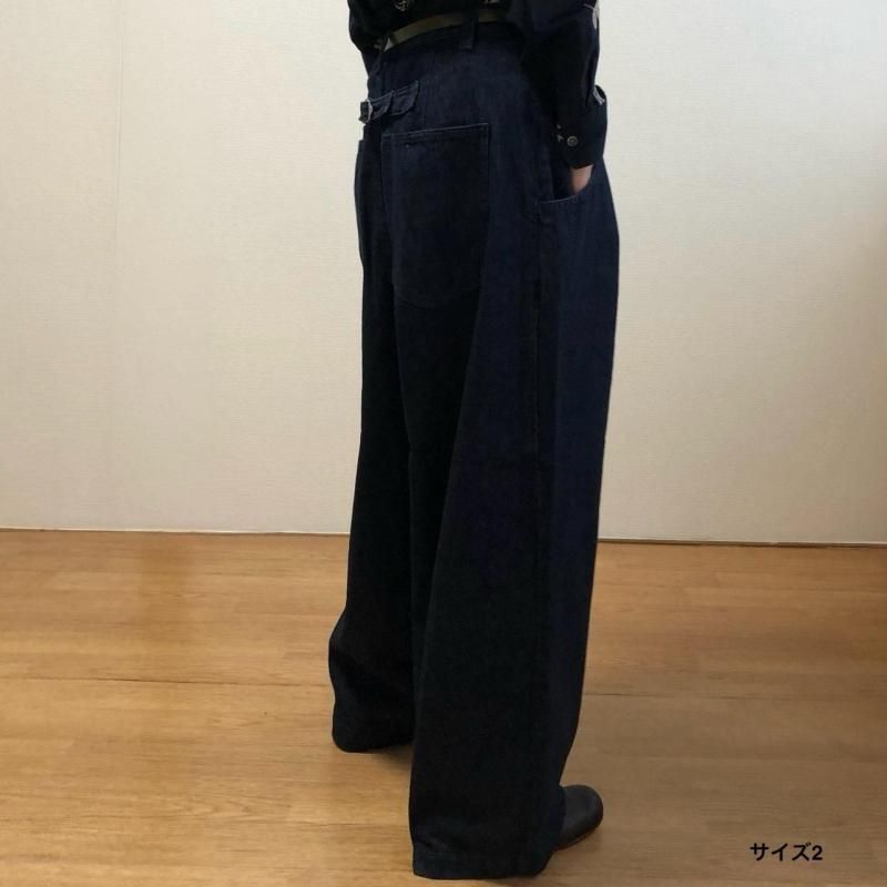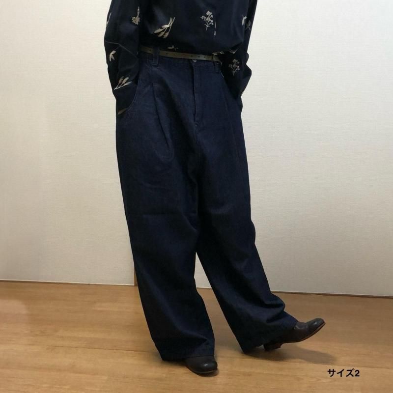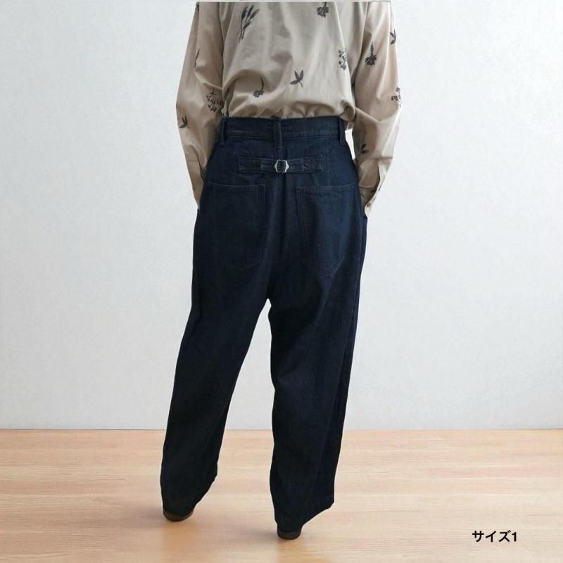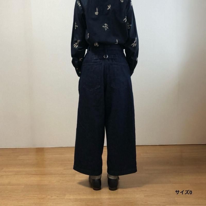 腰まわりをすっきりと見せてくれるタックとその位置。ゆったりとしたヒップや渡巾のライン。股上は深めにとり、ハイウエストでも腰でも履くことができるサイズ感。