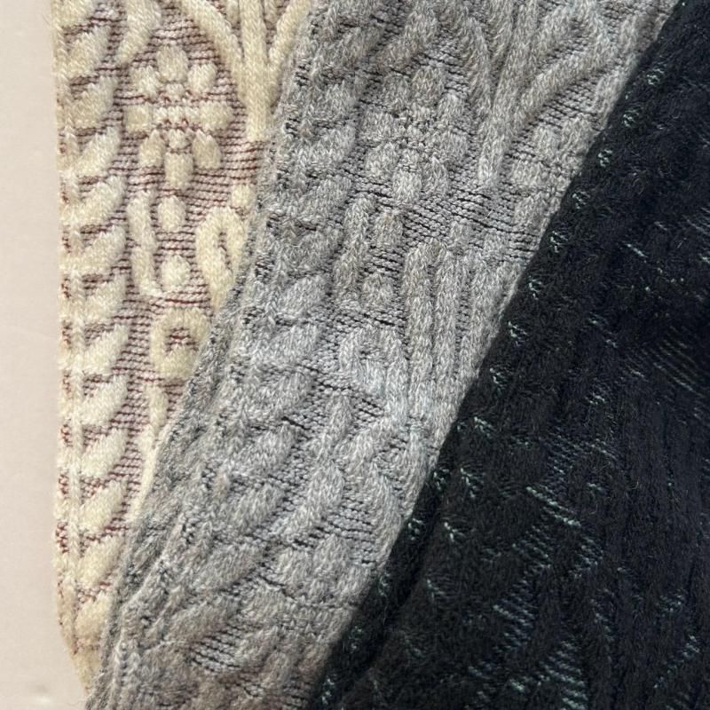 メリノウールのリサイクルウールにラムウールをを混ぜたソフトでふくらみのある糸をベースに、程よい厚みに編み立てられています。