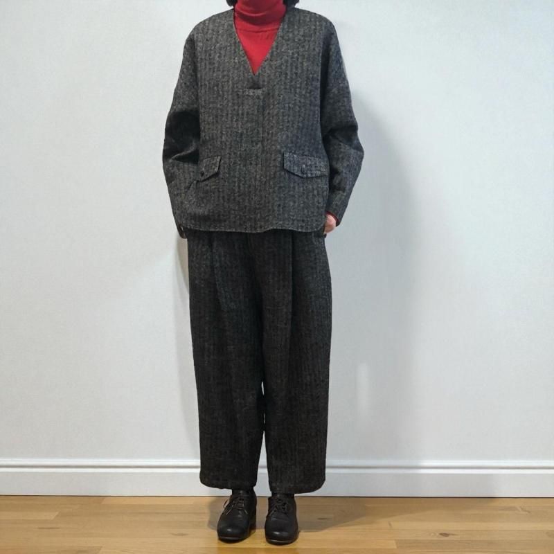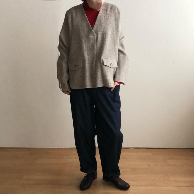 経糸にノルマンディリネン、緯糸にシェットランドウールの混紡糸を使用した、ウールリネンのヘリンボーン生地のスモックです。