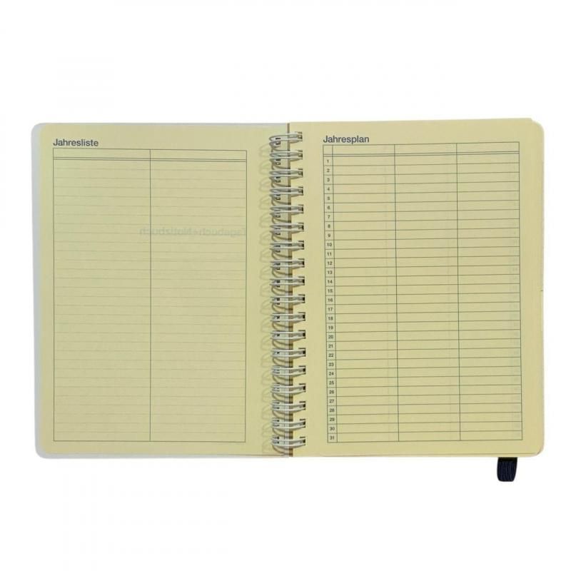 表紙を開くと、タイトルや使用開始日、目標設定などを書き込める中表紙が1ページ、To Doなど自由に活用できるリストが1ページ、年間の記入ができるカレンダーがジャバラで1ページ、単体1ページ、マンスリーページが見開き1ヵ月の計12ヶ月分、ブロックタイプのウィークリーページが見開きで8日間、約52週分で1年間使えます。