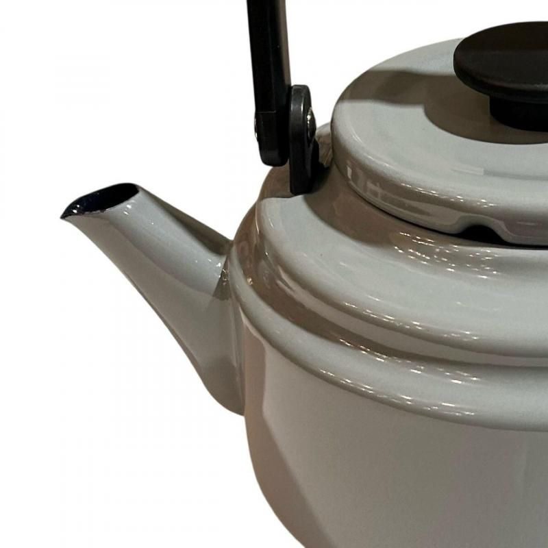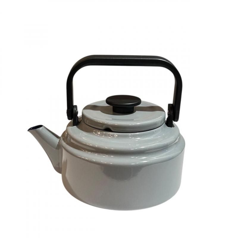 どっしりとした安定感のあるフォルム、樹脂製の水平まで倒れる持ち手が特徴の、琺瑯のやかん。
