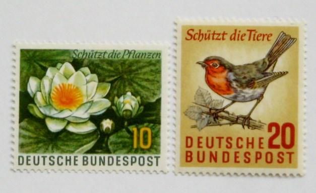 コマドリとスイレンの絵柄の「自然保護」切手2枚セットです。1957年。